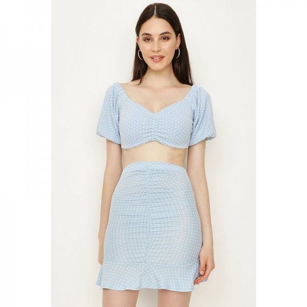 Embrace the sun with our baby blue polka dot ruched front puff sleeve top. Featuring a ruched front detail. Pair with its co-ord skirt and a high heels.